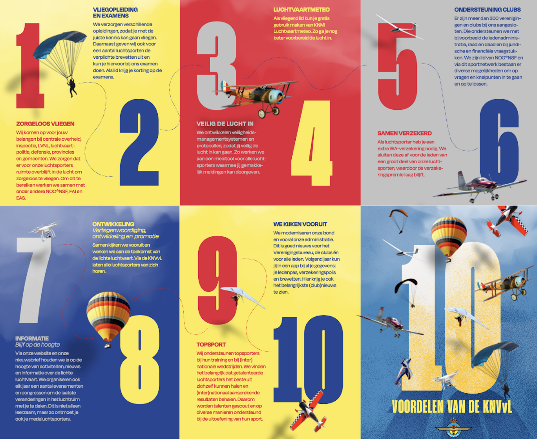 Sinds 1907 is de Koninklijke Nederlandse Vereniging voor Luchtvaart dé vereniging voor alle luchtsporten in Nederland. Al meer dan honderd jaar vertegenwoordigen wij ruim 14.500 luchtsporters en luchtvaartliefhebbers. Wat hebben wij onze leden en aangesloten clubs te bieden? Tien redenen om lid te zijn en vooral ook te blijven lees je hieronder.
